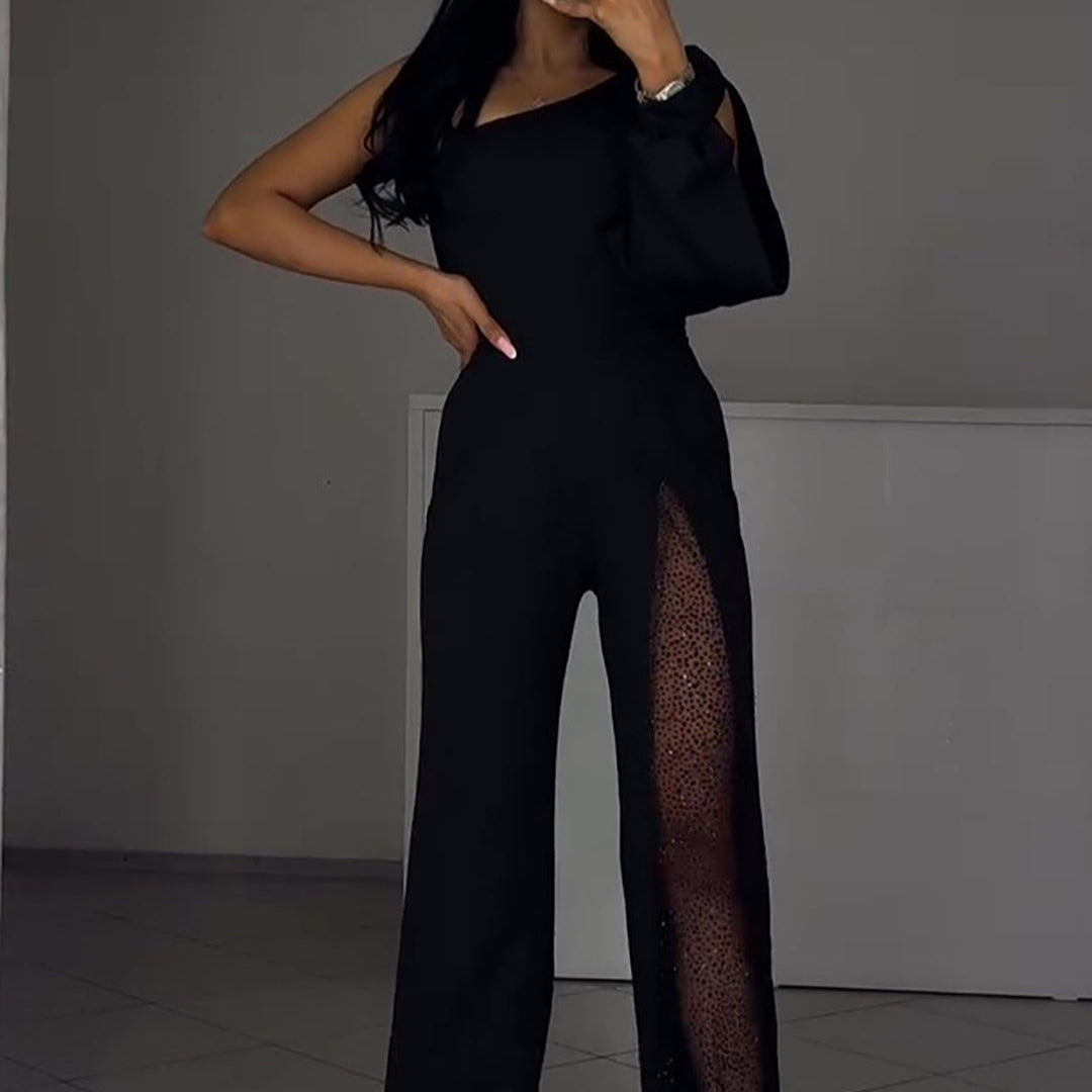 Parfaite pour les occasions spéciales ou une sortie en soirée, cette combinaison allie modernité et sophistication. Son design à manches asymétriques et détails transparents en mesh offre une allure audacieuse et raffinée, idéale pour captiver tous les regards.