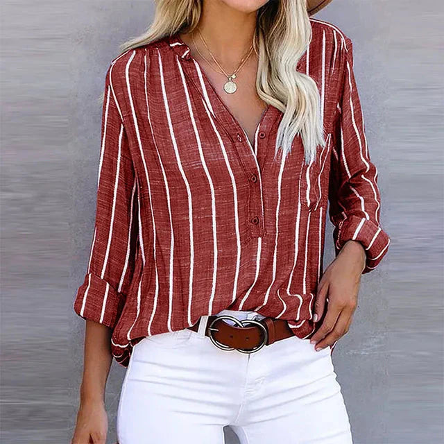 Séréna Rayée – Blouse Légère à Col V et Manches Retroussées