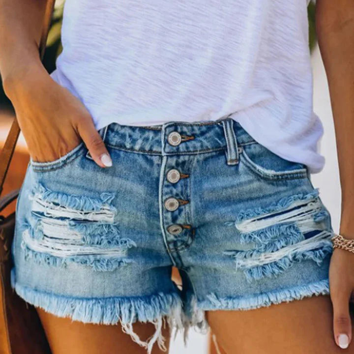 Affichez votre Style avec les Shorts en Jean Tracy – Taille Haute, Effet Usé & Franges Tendance !